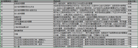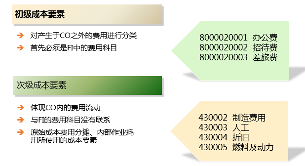 成本要素可理解为CO模块中的科目,用于描述发生了什么样的成本,从成本属性上来讲,可以分为生产成本、管理费用、销售费用、财务费用、研发费用,从成本内容上来讲,可分为材料成本、人工成本、机器成本、物流成本、维修成本、差旅费、电话费等,SAP中对于成本属性使用功能范围来对应,成本内容则使用成本要素来对应。SAP中的成本要素分为两大类。一类是初级成本要素,它们是财务会计中的损益类科目,但并不是所有损益类科目都可以设置成初级成本要素,具体需要根据实际业务确定,即是否需要在CO模块进行计划、核算确定;另一类是次级成本要素,它们可以用来描述管理会计内部各成本对象间成本流转时的成本性质,仅在CO中使用,并不体现在FI层面(S4里FICO已经打通,初级和次级成本要素也统一在FS00中创建)。次级成本要素举例:单位的食堂本身会发生很多费用,比如场地、人员、燃料、粮食、副食品,等等,这些都是食堂的初级成本要素。当食堂的费用分摊到各部门时,我们不再关心其费用明细,我们只需要以类似“食堂伙食费”这样在会计科目表中的次级成本要素汇总表示其性质就可以了。而食堂的初级成本要素,在考核食堂本身的管理才是有用的。