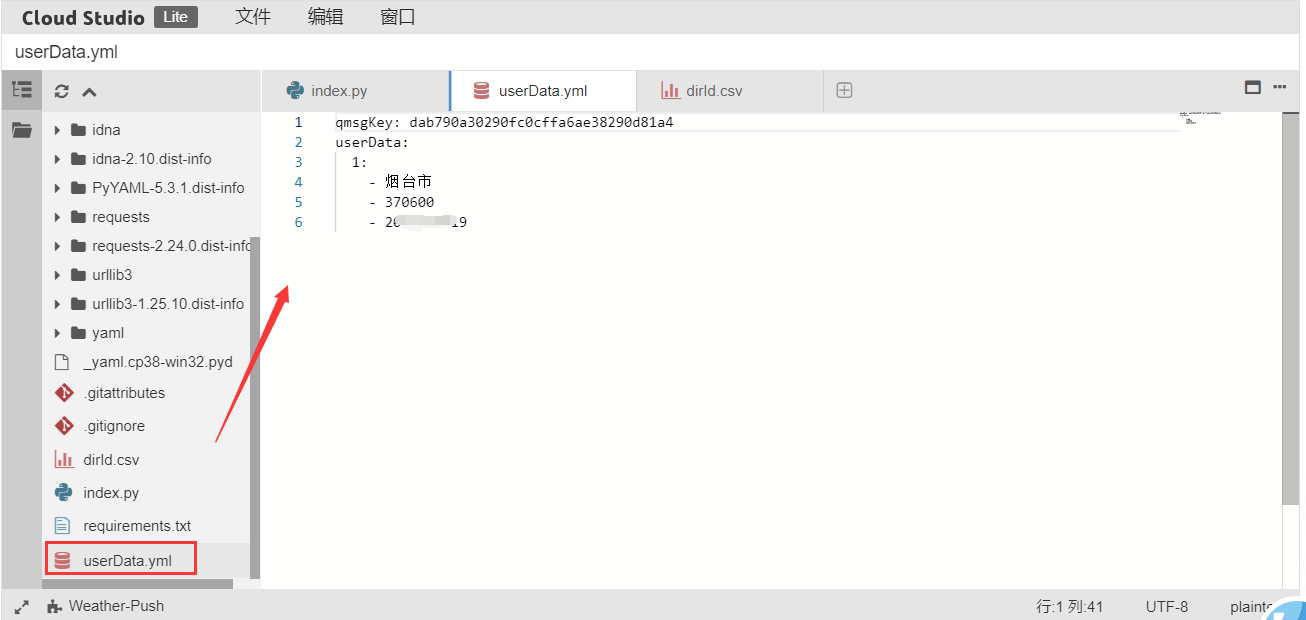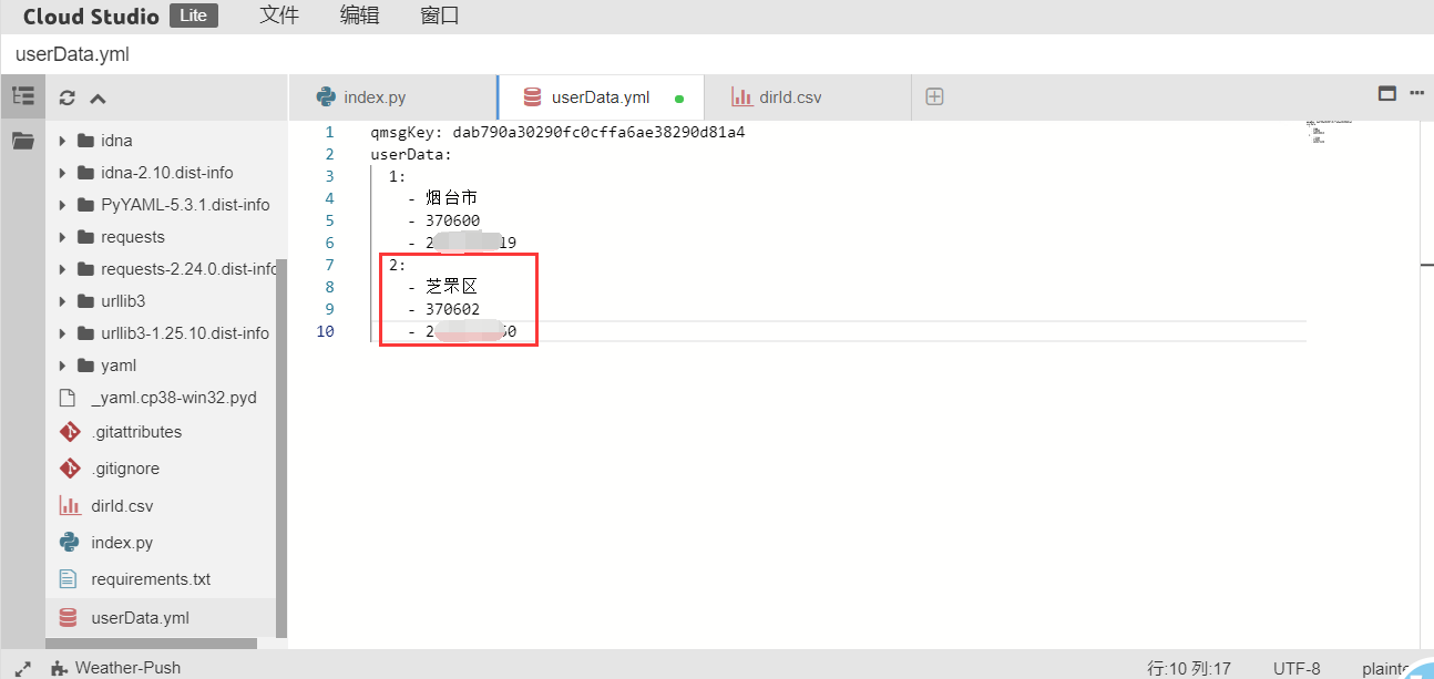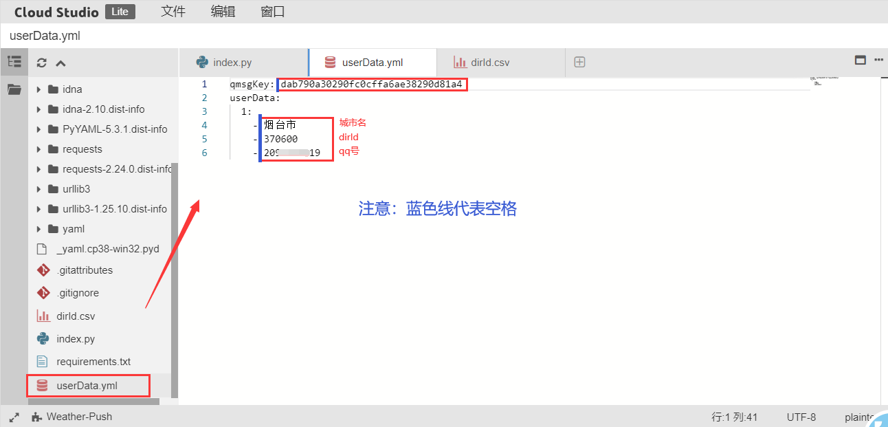 - 按照下图格式在 `userData.yml` 中添加城市信息: