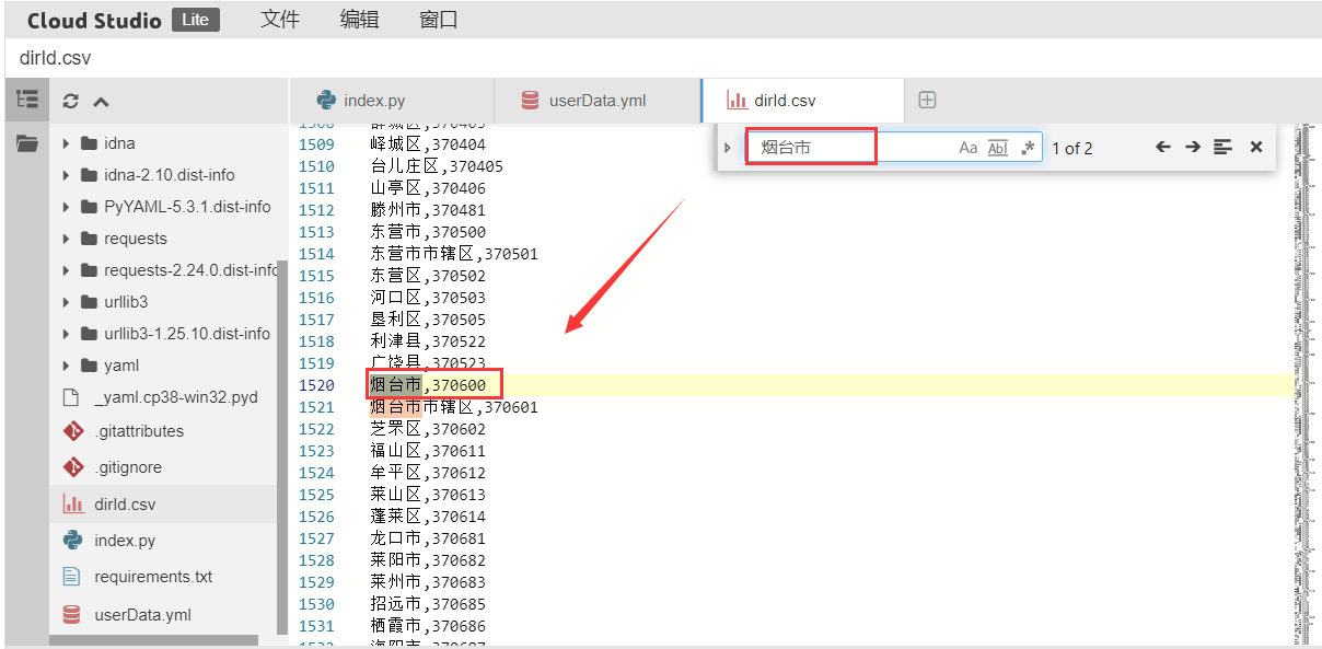 - 快捷键: `ctrl+f` ,输入城市名(烟台为例)按下回车,复制后面对应的dirId: