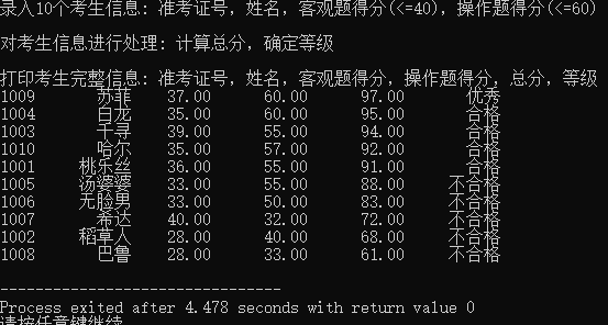 printf("\n打印考生完整信息: 准考证号,姓名,客观题得分,操作题得分,总分,等级\n");