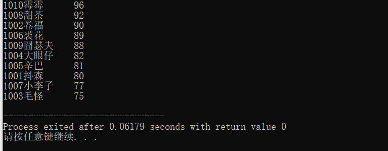 printf("%-6d%-10s%3d\n",st[i].num,st[i].name,st[i].score);