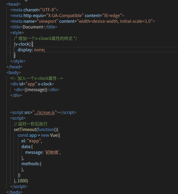 1. 使用setTimeout模仿延迟将数据渲染到<div></div>,此时,页面会先显示原始的{{message}},等Vue创建并将数据messge渲染到div时,再将获取到的变量数据更新至页面