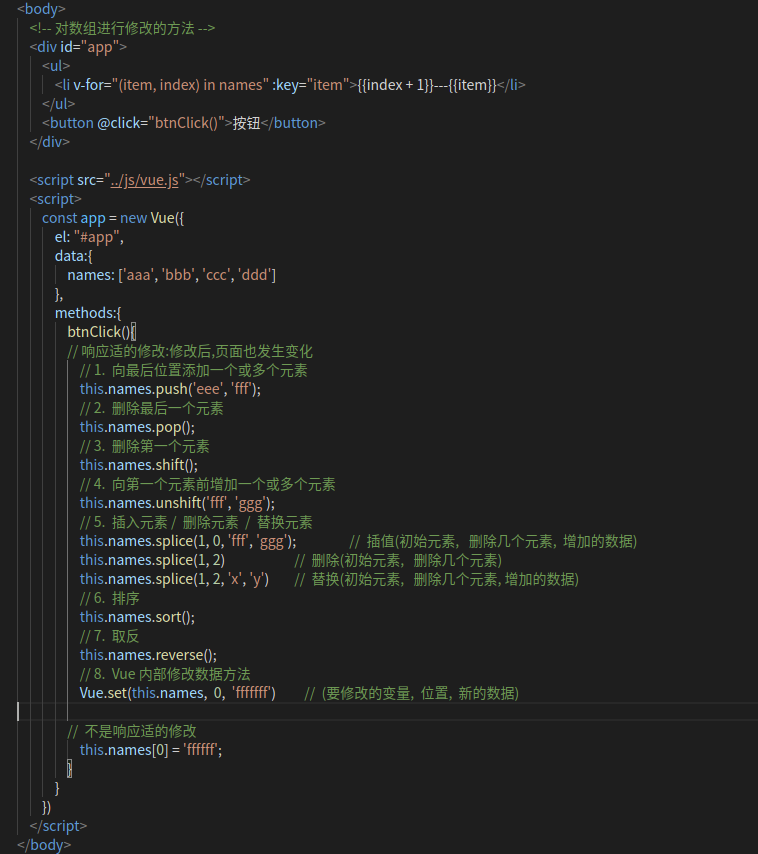 响应式更新vue数据:因为下述方法都需要用到下标作为参数,因此都是针对数组进行数据更新的方法。