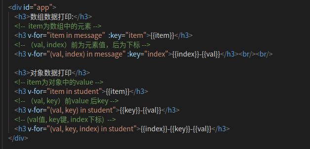1. DOM中使用v-for=(val in 数组/对象),取得的是数组元素或对象中的 值val