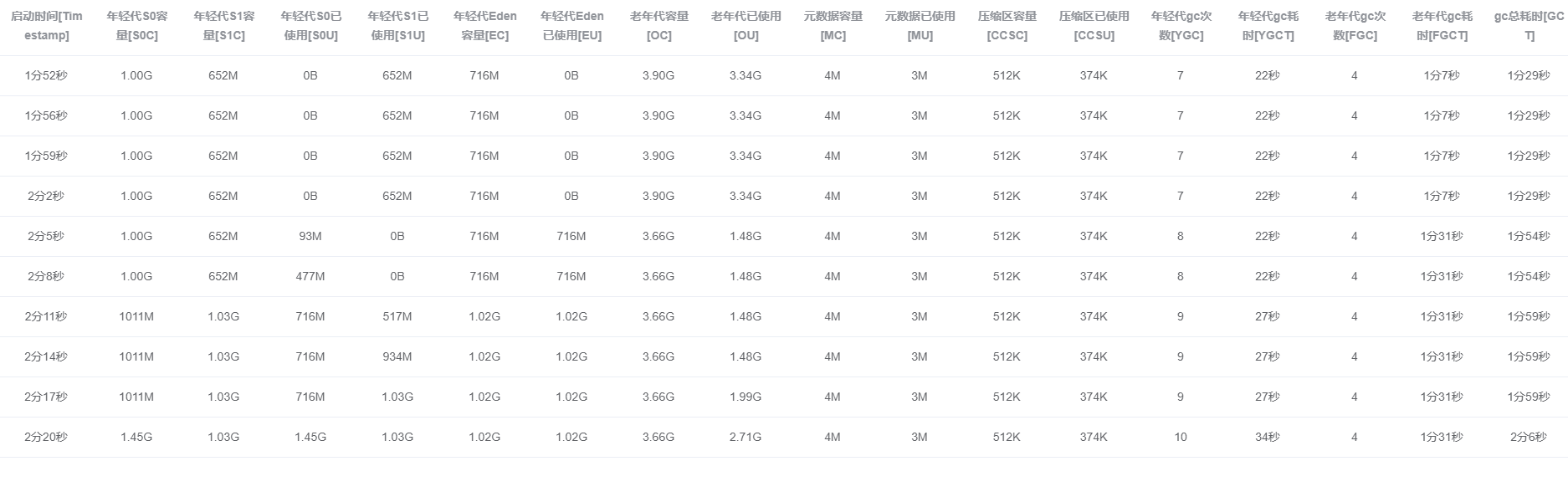 jstat -gc -t 3792 3000 9999 对PID为3792的java进程,每3秒采集一次GC信息,采集9999次后停止。