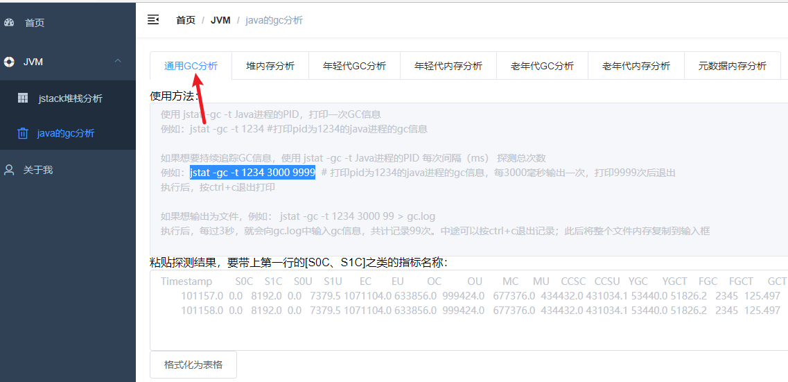 步骤4: 把GC内存粘贴进去, 点击【格式化为表格】,则显示格式化后的结果。