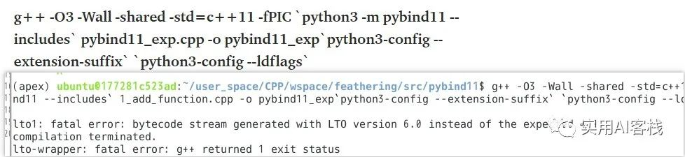 如果编译时出现python3-config --ldflags,则会出现fatal error: bytecode stream generated with LTO version x.0 instead of the expected x.x(3_bug1_snapshot)的情况。这个不是g++版本的问题。