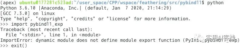 使用上述代码对pybind11_exp.cpp进行编译,“pybind11_exp.cpp -o pybind11_exp”中模块名称"pybind11_exp"需和pybind11_exp.cpp代码中的一致。编译后会生成文件pybind11_exp.cpython-36m-x86_64-linux-gnu.so