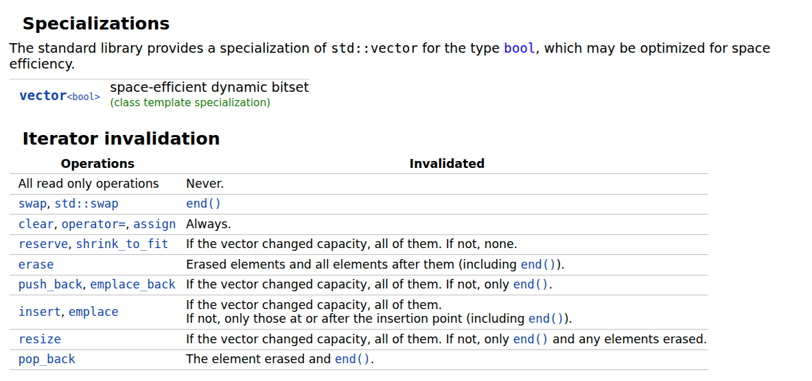 某些修改容器的操作(如向std::vector添加元素)可能导致容器中元素的地址发生改变。此时指向这些元素的现有迭代器将失效。优质的C++参考文档应注明哪些容器操作可能或必然导致迭代器失效。例如,可参阅cppreference中std::vector的“迭代器失效”章节。