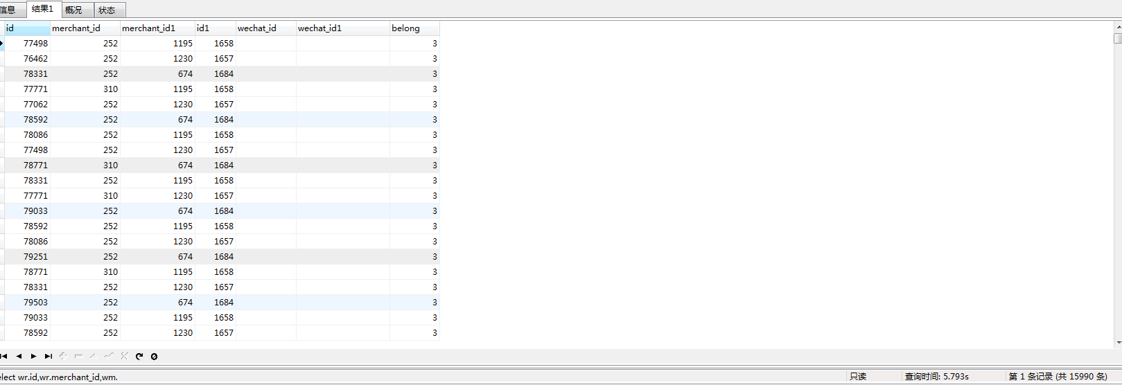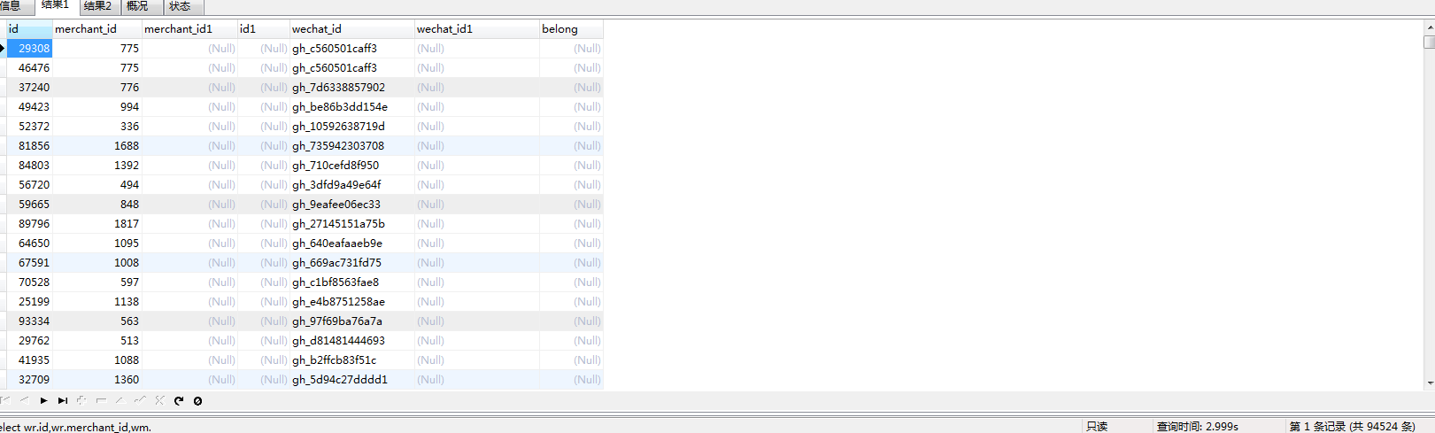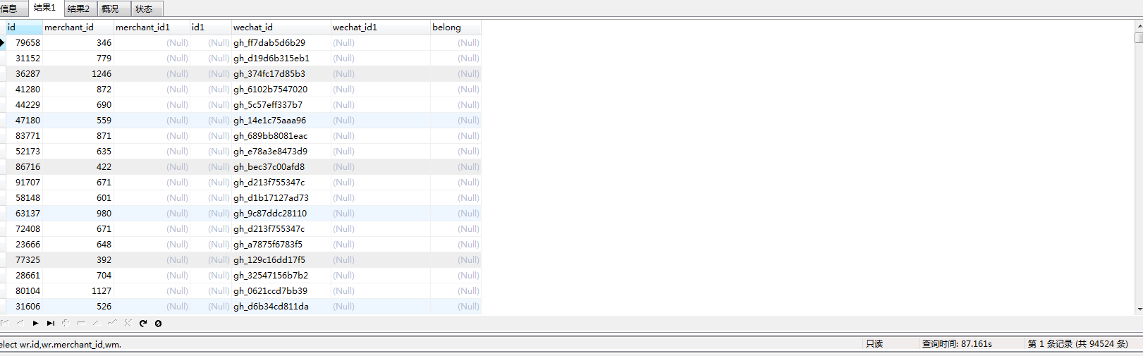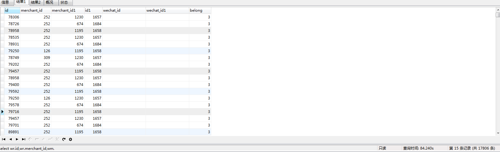 [SQL] select wr.id,wr.merchant_id,wm.merchant_id,wm.id,wr.wechat_id,wm.wechat_id,wm.belong from wechat_report wr right join wechat_merchant wm on wr.wechat_id = wm.wechat_id and wm.belong = 3 order by wm.wechat_id; 受影响的行: 0 时间: 78.559s [SQL] select wr.id,wr.merchant_id,wm.merchant_id,wm.id,wr.wechat_id,wm.wechat_id,wm.belong from wechat_report wr right join wechat_merchant wm on wr.wechat_id = wm.wechat_id where wm.belong = 3 order by wm.wechat_id; 受影响的行: 0 时间: 5.681s