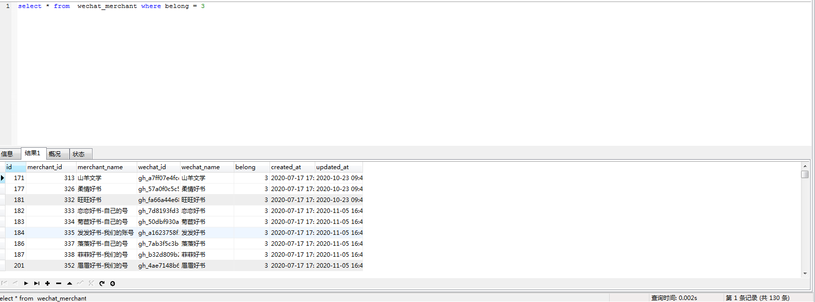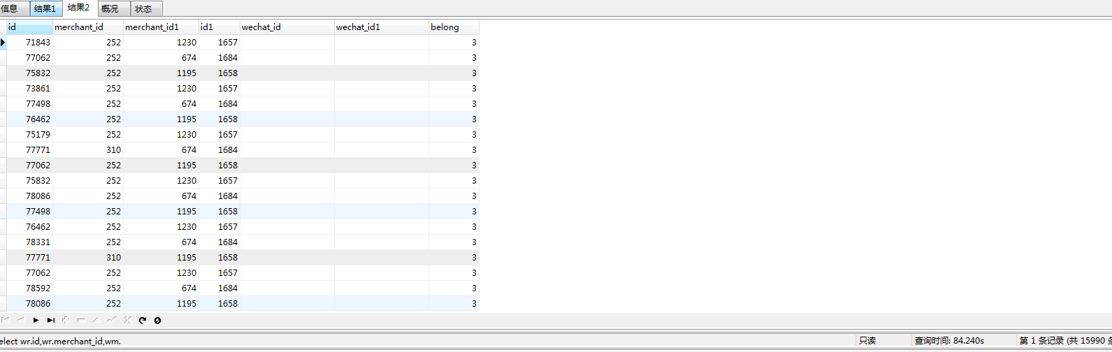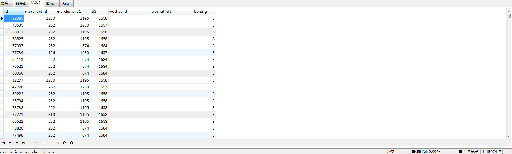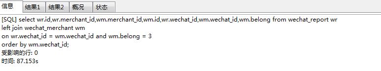 select wr.id,wr.merchant_id,wm.merchant_id,wm.id,wr.wechat_id,wm.wechat_id,wm.belong from wechat_report wr left join (select * from wechat_merchant where belong = 3) wm on wr.wechat_id = wm.wechat_id order by wm.wechat_id; select wr.id,wr.merchant_id,wm.merchant_id,wm.id,wr.wechat_id,wm.wechat_id,wm.belong from wechat_report wr left join wechat_merchant wm on wr.wechat_id = wm.wechat_id where wm.belong = 3 order by wm.wechat_id