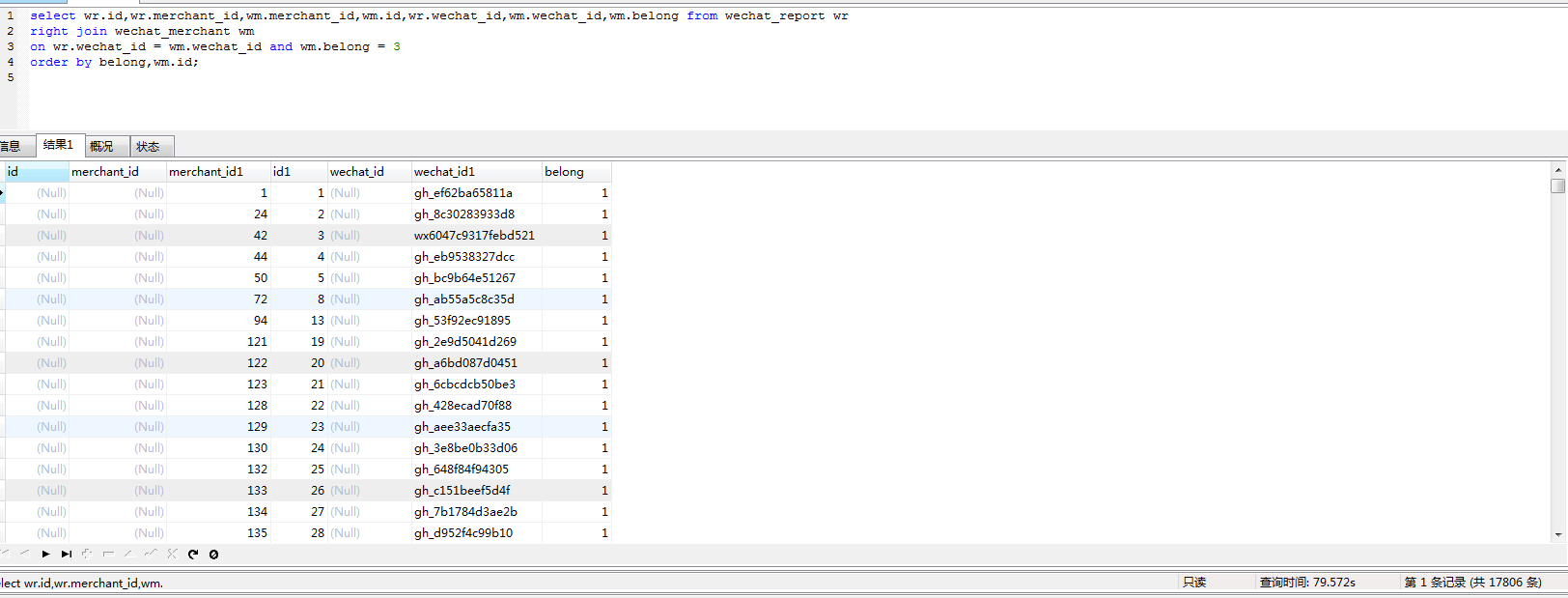 select wr.id,wr.merchant_id,wm.merchant_id,wm.id,wr.wechat_id,wm.wechat_id,wm.belong from wechat_report wr right join (select * from wechat_merchant where belong = 3) wm on wr.wechat_id = wm.wechat_id order by wm.wechat_id;