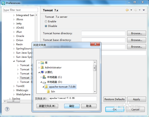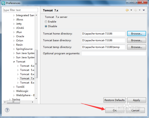 点击浏览按钮选择Tomcat的安装目录,然后点击OK按钮就配置完成了,如图