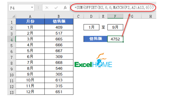 =SUM(OFFSET(B2,0,0,MATCH(F2,A2:A13,0)))