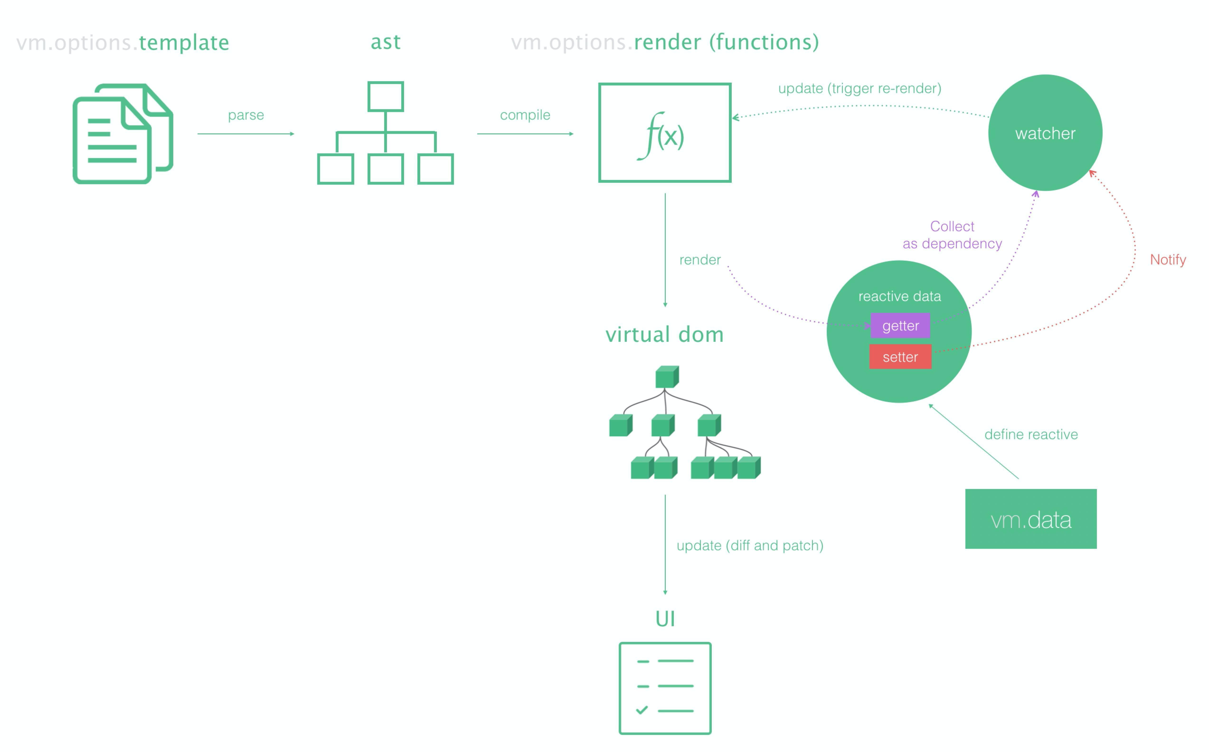 - 渲染函数:渲染函数是用来生成Virtual DOM的。Vue推荐使用模板来构建我们的应用界面,在底层实现中Vue会将模板编译成渲染函数,当然我们也可以不写模板,直接写渲染函数,以获得更好的控制 (这部分是我们今天主要要了解和学习的部分)