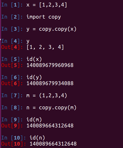 运行效果可以看出新复制的列表可原列表的内存地址是不同的,复制的元组与原元组的内存地址是相同的。