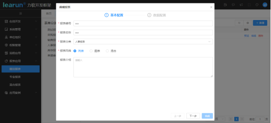 LeaRun低代码开发平台的报表应用目录下选择自己所需要设计的报表类型,如只是需要功能相对简单的简洁报表,点击新建后,进行报表编号、名称、分类、风格等基本信息配置填写。