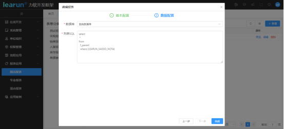 随后即可进行数据源配置,连接相关信息、测试连接。并根据自身需求编写出自定义报表所需要的SQL语句。