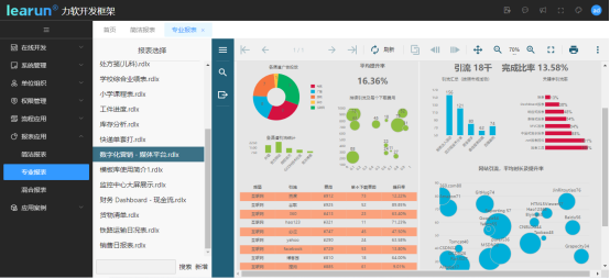 LeaRun低代码开发平台是拥有一款强大的报表开发和系统搭建工具,提供丰富的组件生成不同类型和功能的报表,既能与开发的软件项目紧密集成,也可独立部署运行,支持多数据源,具有个性化、灵活、稳定等特性,可以实现各类报表的设计、管理、权限控制、数据填报,大大简化前后端的报表开发成本。