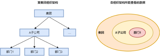 回想一下上述的例子,集团能够查看旗下所有子公司的数据,但A子公司某个部门(相当于用户)也仅能查看到A子公司的数据,无法查看别的子公司,由此可以得到的结论是:低级用户所能查看的数据为其所属组织所能查看数据的子集。