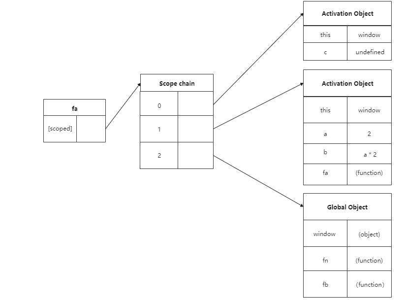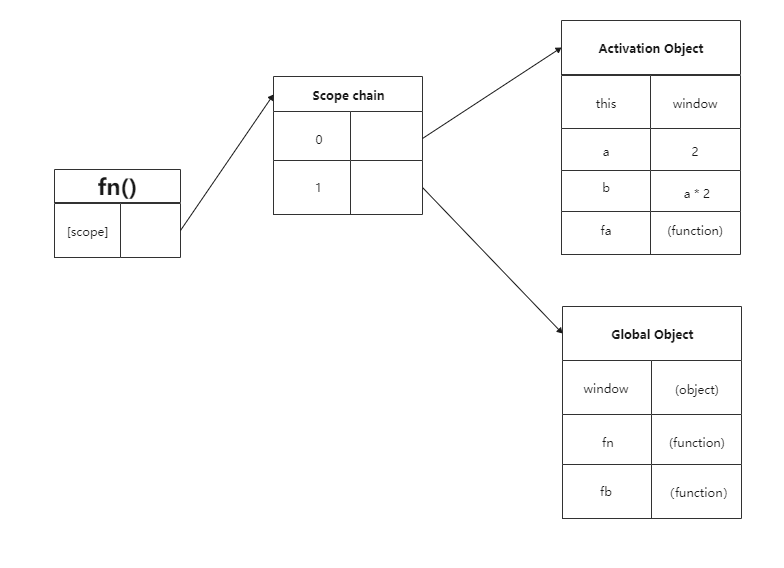 在以上代码中先定义了fn()函数和fb变量,这时只有一个全局的作用域,包含一个fn()方法和一个undefined的fb,在fn()函数运行时,会为函数创建一个执行环境,产生一个fn()的活动对象,然后复制了全局作用域中的变量对象保存在自己的作用域链中,在之后的fa()创建时,先创建一个fa()的活动对象,然后复制了fn()的作用域链保存在自己的作用域链中。