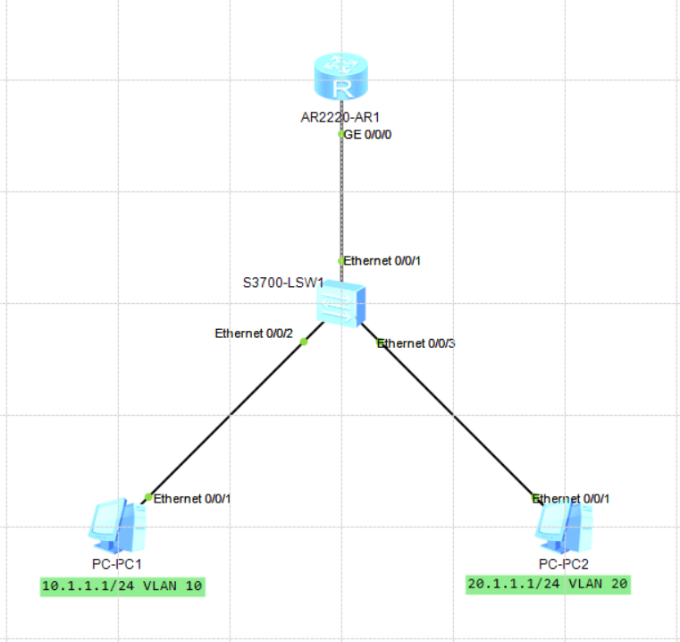 <Huawei>sys [Huawei]sys R1 [R1]int g0/0/0.1 #创建子接口 [R1-GigabitEthernet0/0/0.1]dot1q termination vid 10 #启用dot1q协议,允许其接受相应的VLAN流量 [R1-GigabitEthernet0/0/0.1]ip add 10.1.1.254 24 #配置子接口的IP地址,作为PC-1的网关 [R1-GigabitEthernet0/0/0.1]arp broadcast enable #启用ARP广播功能,让子接口可以通过发送ARP广播来请求目的IP地址所对应的MAC地址 [R1-GigabitEthernet0/0/0.1]int g0/0/0.2 [R1-GigabitEthernet0/0/0.2]dot1q termination vid 20 [R1-GigabitEthernet0/0/0.2]ip add 20.1.1.254 24 [R1-GigabitEthernet0/0/0.2]arp broadcast enable