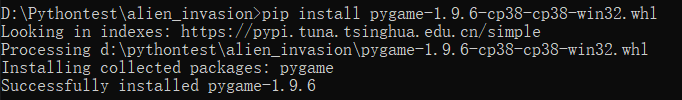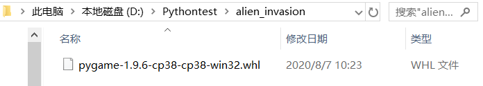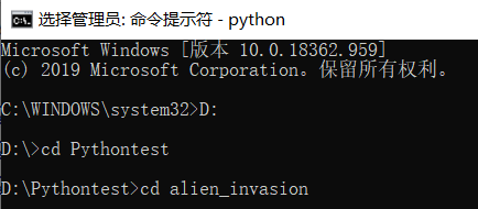 使用windows命令进入alien_invasion文件夹。我这里的alien_invasion文件夹在D盘的Pythontest文件夹中。