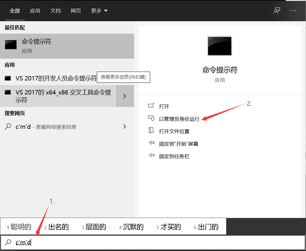 在左下角任务栏下面的搜索栏输入cmd,然后以管理员身份运行 ( 这点很重要!!!),否则后面的操作中都会提醒你没有操作权限需要添加--user操作符。具体操作如下图: