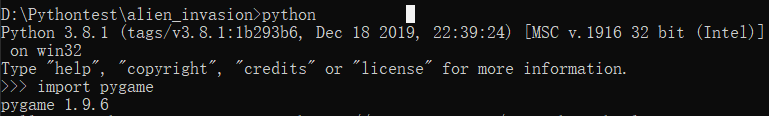 1 D:\Pythontest\alien_invasion>python 2 Python 3.8.1 (tags/v3.8.1:1b293b6, Dec 18 2019, 22:39:24) [MSC v.1916 32 bit (Intel)] on win32 3 Type "help", "copyright", "credits" or "license" for more information. 4 >>> import sys 5 >>> sys.version 6 '3.8.1 (tags/v3.8.1:1b293b6, Dec 18 2019, 22:39:24) [MSC v.1916 32 bit (Intel)]' 7 >>>