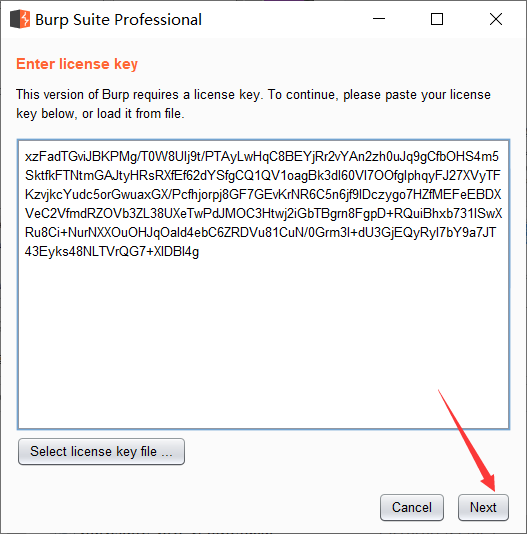 - 打开注册机:burp-loader-keygen.jar,然后点击run,license text 随便填,然后将生成的license 复制粘贴到打开的burp里,点击next。