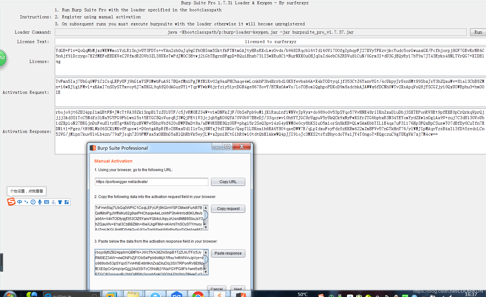 3. 将request 粘贴到activation request ,将自动生成response,再粘贴到burp里最下面的response中,点击next。