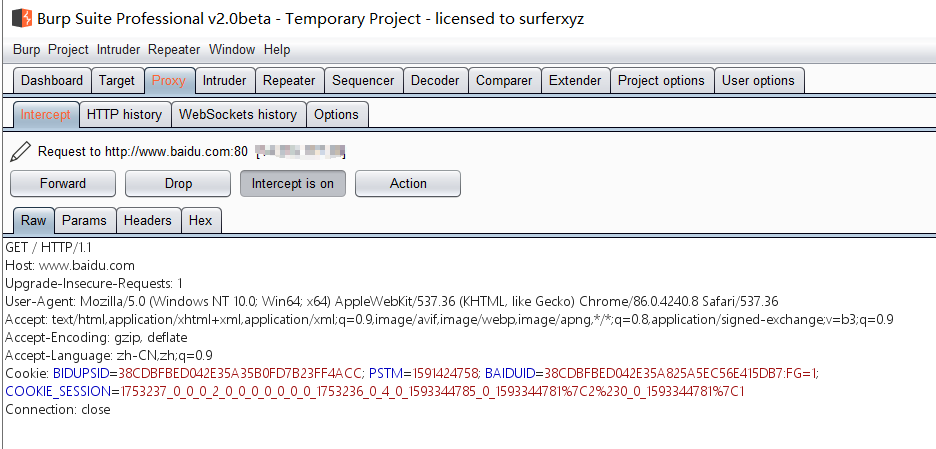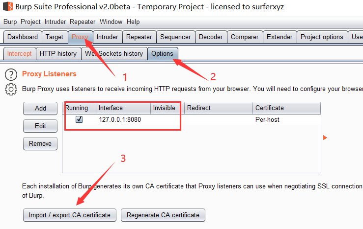 - 打开Burpsuite,查看代理服务器地址及端口(红框内),下面对SwitchySharp的配置要与红框内一致,并导出证书。