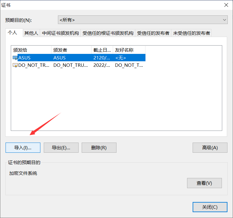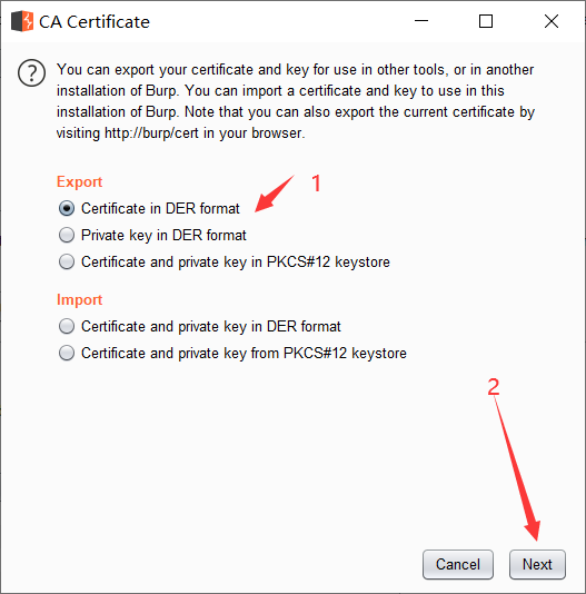 3. 选择“导入”,然后一路继续,最后将之前下载的BurpSuite的证书导入即可。