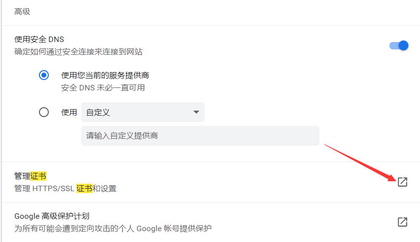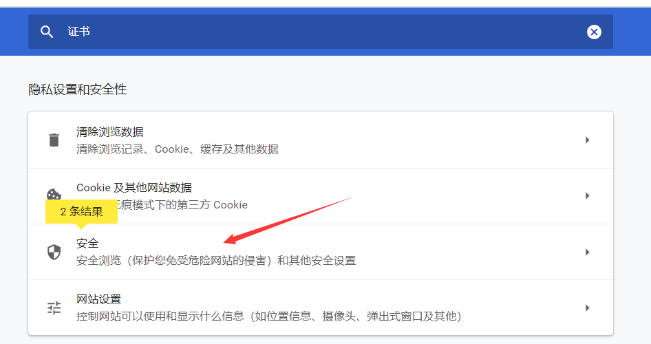 1.打开Chrome的设置,搜索“证书”,点击“安全”并进入。