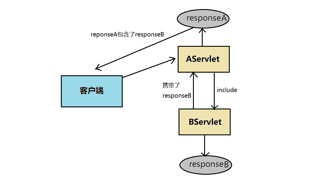 | 下图是请求包含流程,因为BServelt的响应返回给AServlet时携带了responseB,所以AServlet的响应中包含了BServlet的响应,最后返给客户端的响应是两者之和。 |