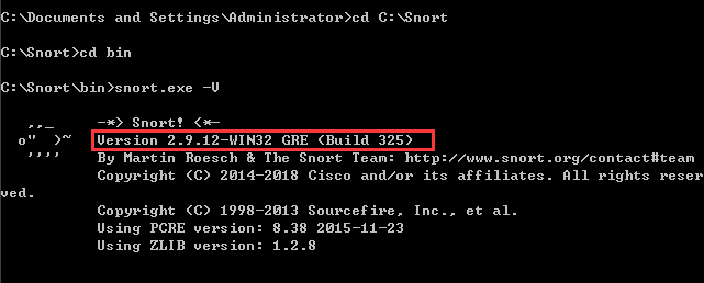 - 切换到snort安装目录的bin目录下,使用-V参数显示snort版本,测试snort是否安装成功