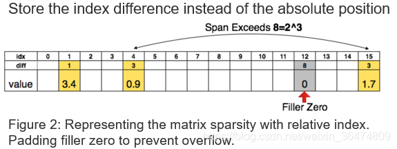 相对位置的参数:在压缩完参数之后,我们存了权值和权值对应的参数。之前的参数存的是绝对的参数,我们现在存相对的参数,就是两个参数的差值,比如我们用三个特存相对的参数,只要两个元素的距离小于8,都能把参数存为3个比特的,如果两个参数的距离大于这个值,我们就在第8个位置设置一个0值。