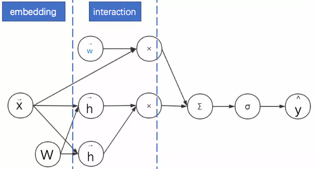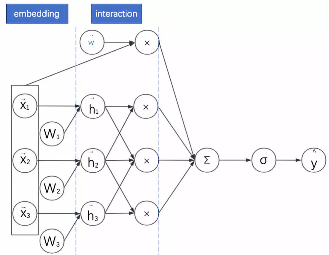 这样考虑其实是给FM增加了一个正则:考虑了领域内的信息的相似性。而且还有一个附加的好处,这些嵌入后的同领域特征可以拼接起来作为更深的神经网络的输入,达到降维的目的。接下来我们将反复看到这种处理方式。