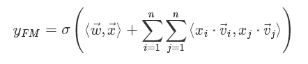 其中vi向量是矩阵W的第i列。为了去除重复项与特征平方项,上式可以进一步改写成更为常见的FM公式: