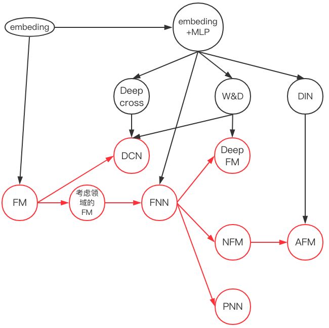 具体来说有两条:其一是从FM开始推演其在深度学习上的各种推广(对应下图的红线),另一条是从embedding+MLP自身的演进特点结合CTR预估本身的业务场景进行推演(对应下图黑线部分)。