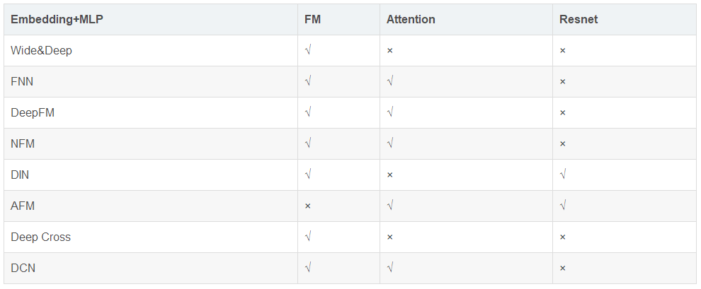 本文从开篇就说明这些模型推演的核心思路是“通过设计网络结构进行组合特征的挖掘”,其在各个模型的实现方式如下: