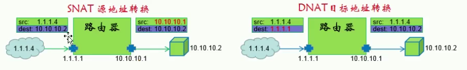 路由器和两侧主机都可以进行正常通信,路由器为了实现内网主机(1.1.1.4)与外网web主机(10.10.10.2)主机的通信,它接收内网主机发送过来的数据包,然后将数据包的源IP地址(1.1.1.4)转换成路由器的外网IP地址(10.10.10.1)