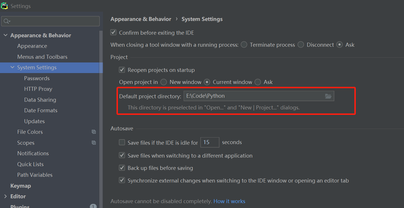 PyCharm------->File——>Settings——>Appearance&Behavior——>System Setting——>Project Opening ------>Default project directory