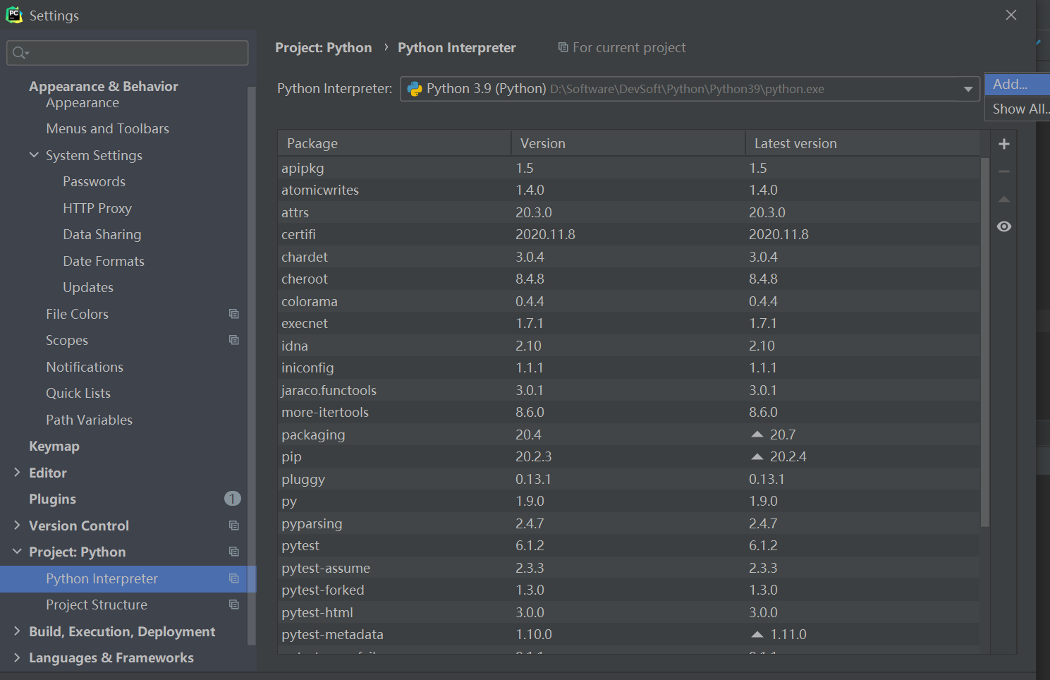 PyCharm------->File——>Settings——>Project:工作目录名称——>Python Interpreter