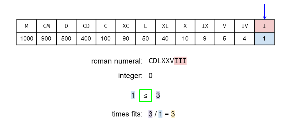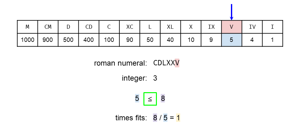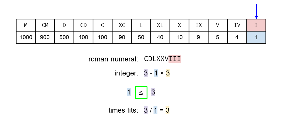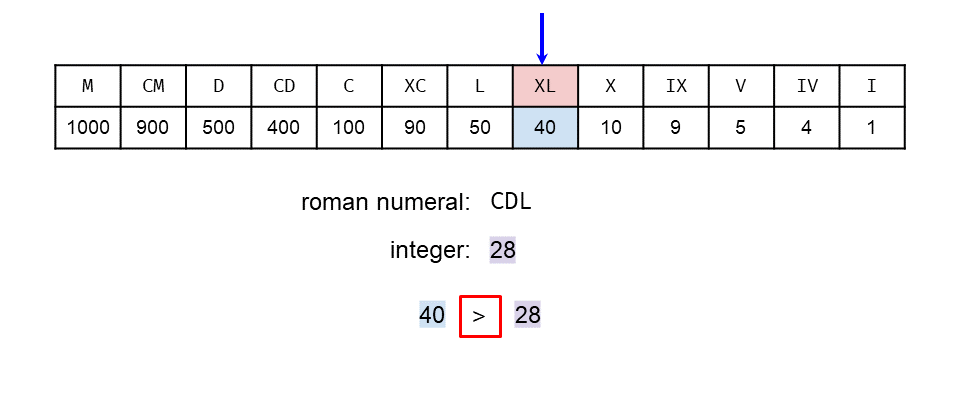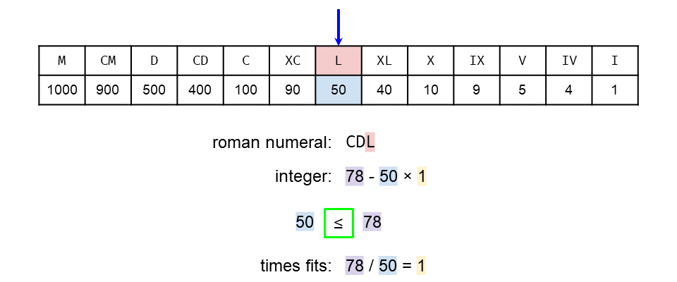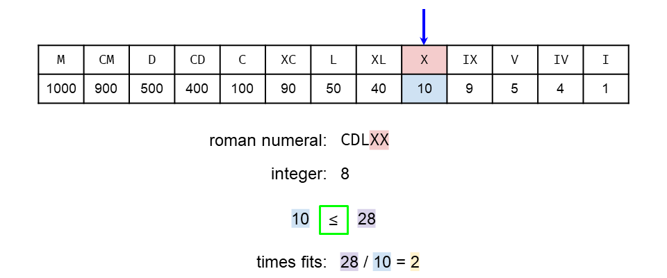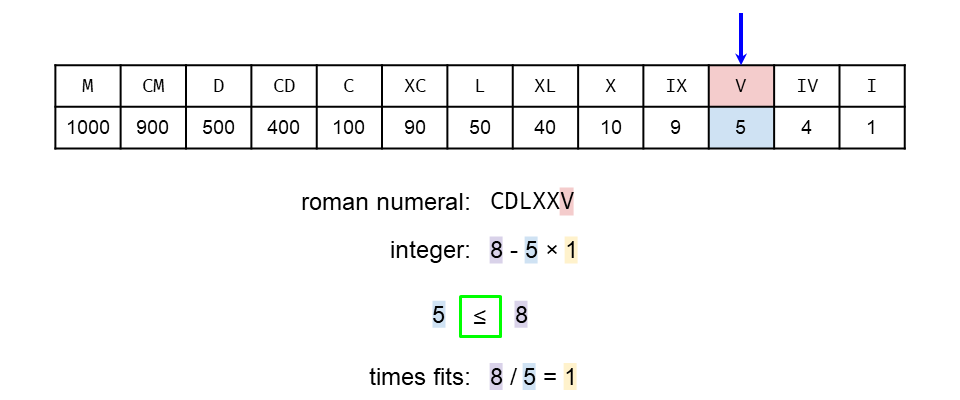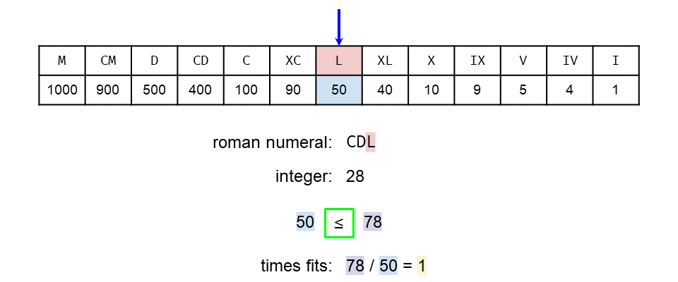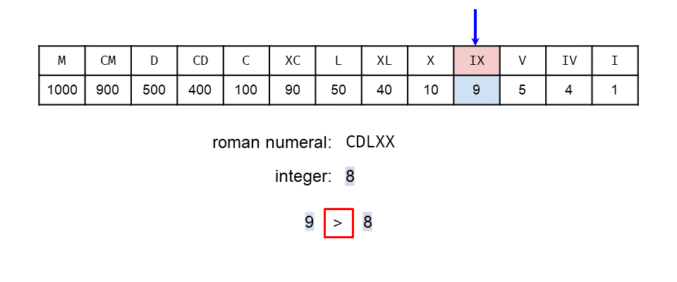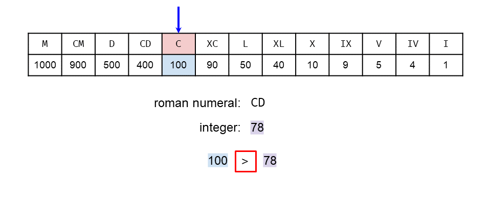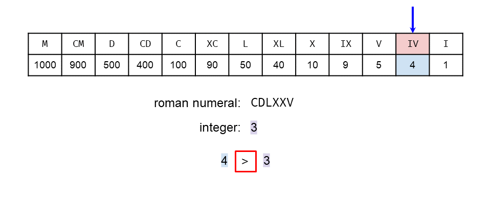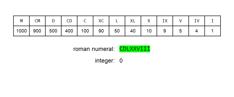 把罗马数字转换成整数的问题比较简单。因此,如果你觉得这个问题很难,我们建议你先解决这个问题。这将使您能够更加熟悉罗马数字的概念,而不会出现将整数转换为罗马数字时出现的“歧义”问题。当将罗马数字转换为整数时,只有一个合理的转换。