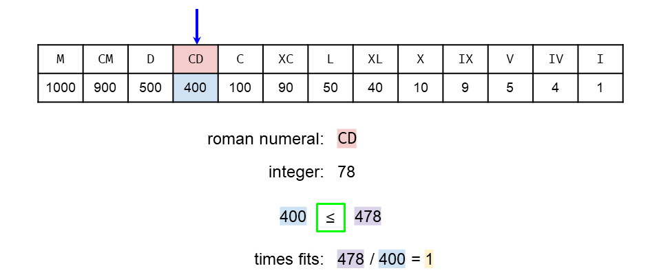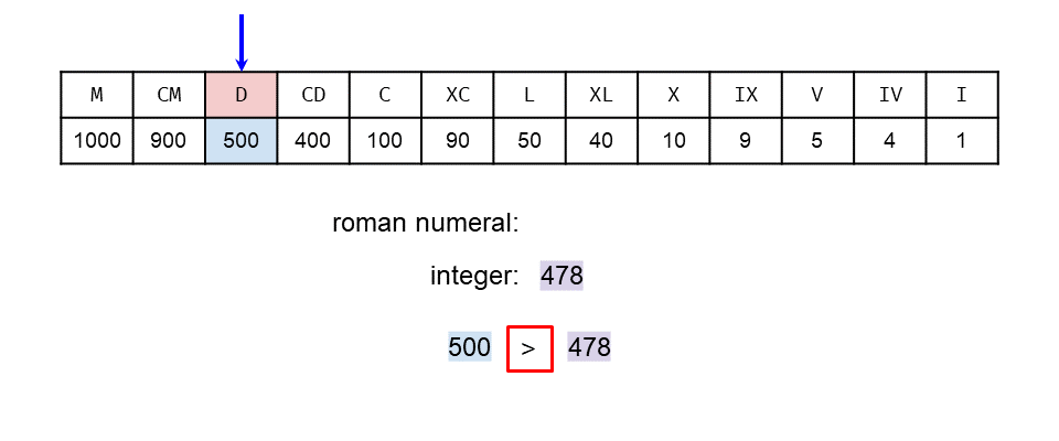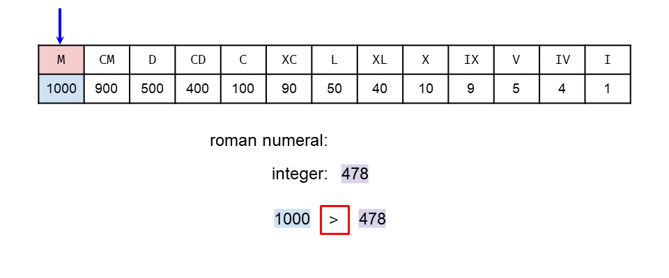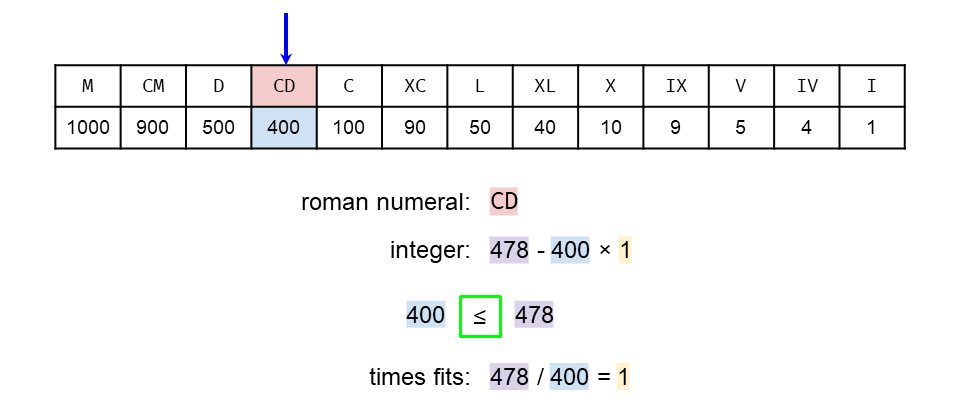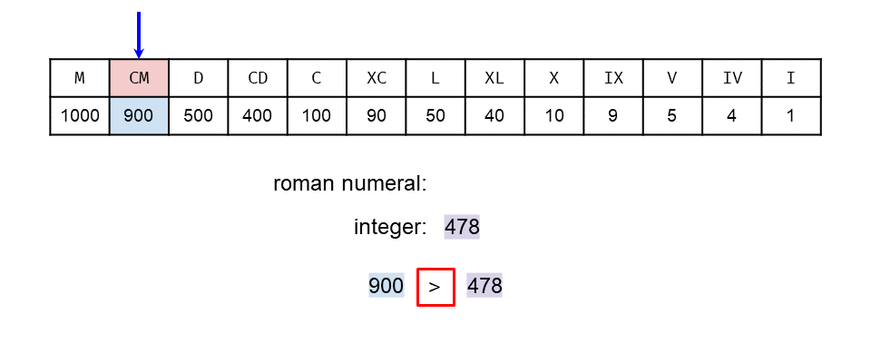现在,假设我们有 100 到 999 之间的余数。接下来考虑在此范围的符号。最高的符号是 CM(900),最低的是 C(100)。此范围内的任何符号都不可能修改成十或一。只要余数仍在100以上,我们就至少可以取 C(100)。这意味着只要数字至少是 100,我们就只能从余数中减去符号。