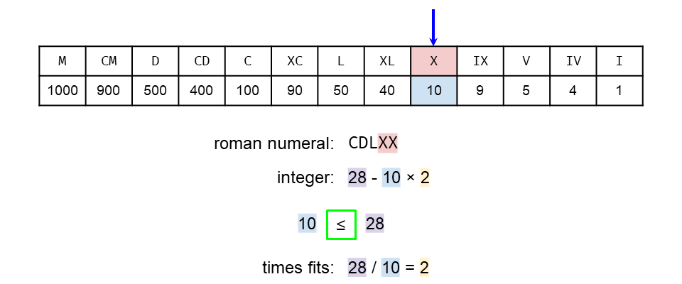 为了表示一个给定的整数,我们寻找适合它的最大符号。我们减去它,然后寻找适合余数的最大符号,依此类推,直到余数为0。我们取出的每个符号都附加到输出的罗马数字字符串上。