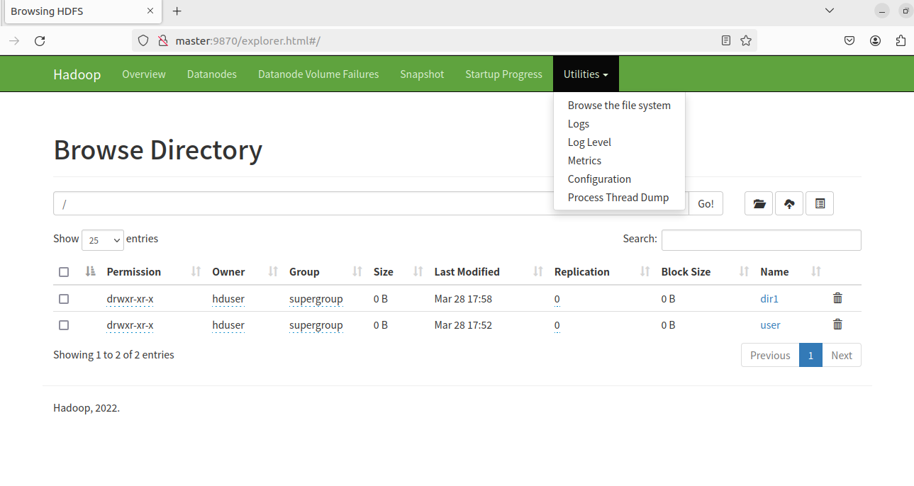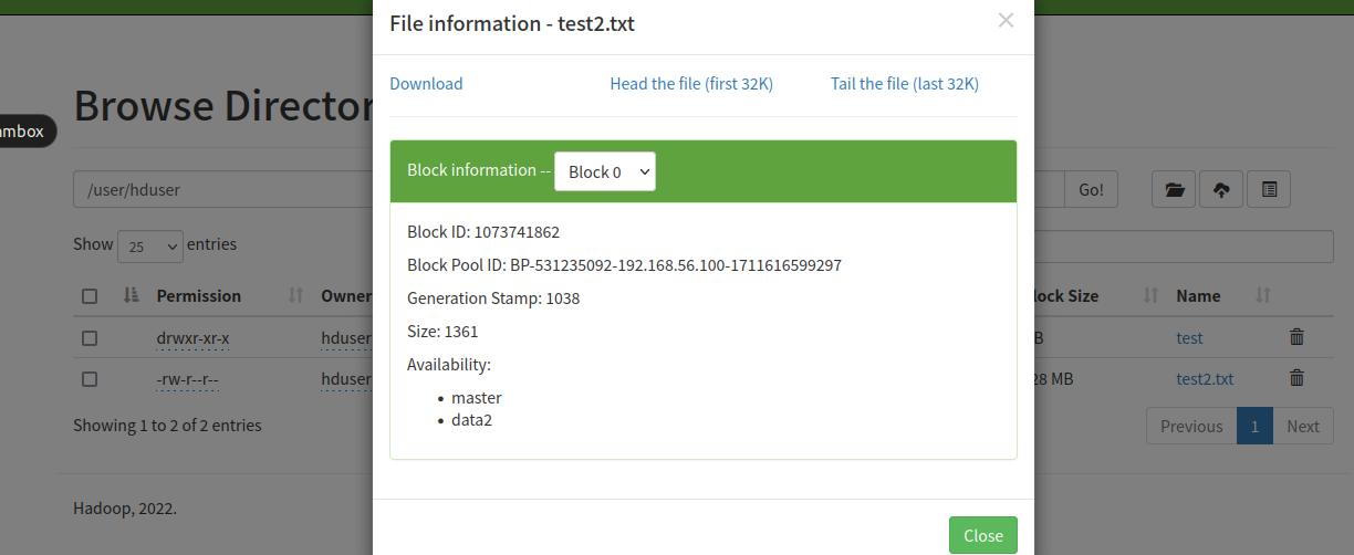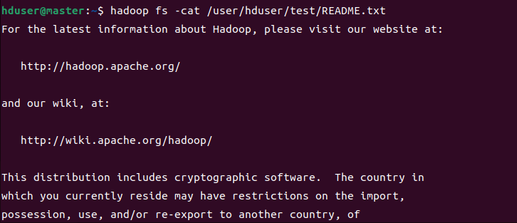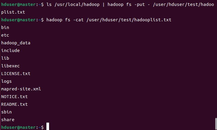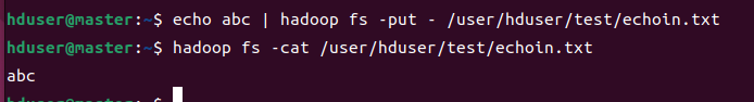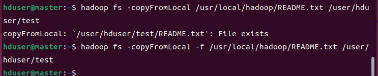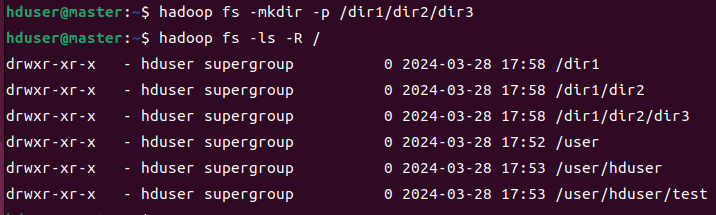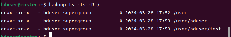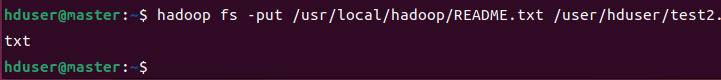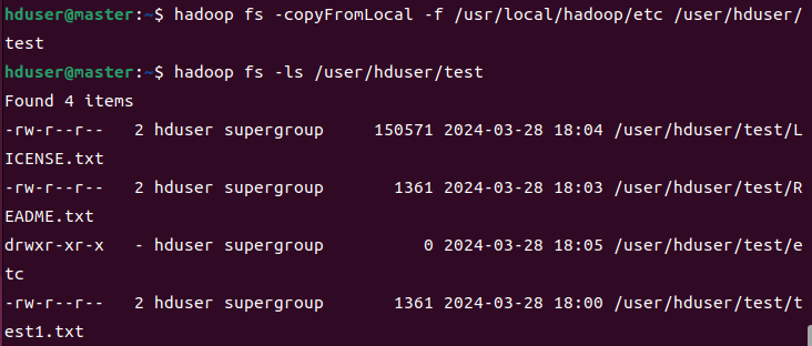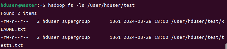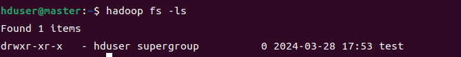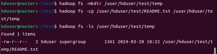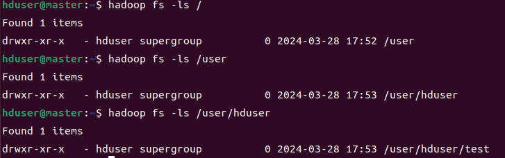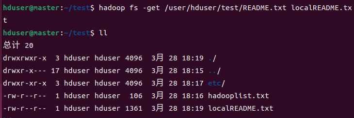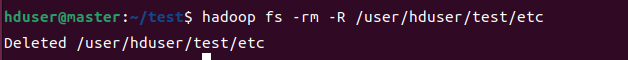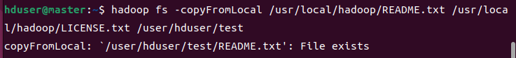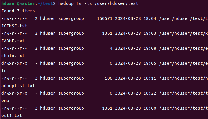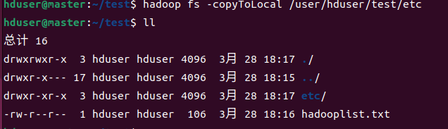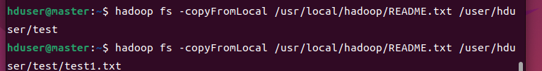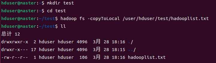 创建hduser下test子目录:hadoop fs -mkdir /user/hduser/test