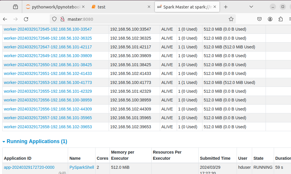 输入命令:PYSPARK_DRIVER_PYTHON=ipython PYSPARK_DRIVER_PYTHON_OPTS="notebook" MASTER=spark://master:8081 pyspark --num-executors 1 --total-executor-cores 2 --executor-memory 512m
