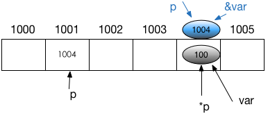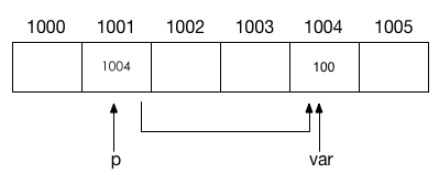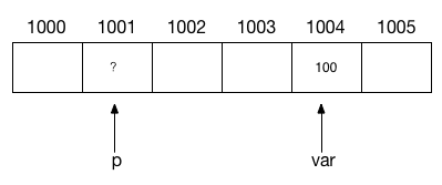 2.创建指针:变量var的地址是1004,是一个数字,地址的这个数字可以用另一个变量来保存它,假设这个变量为p,此时变量p未被初始化,系统为它分配了空间,但值还不确定,如下图所示。